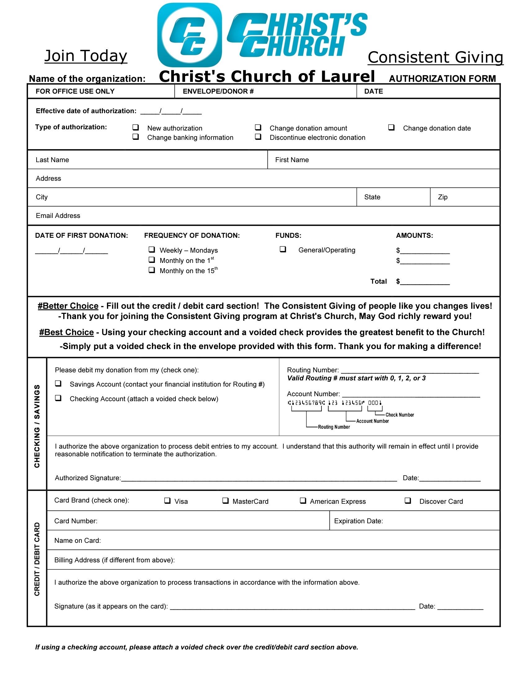 The Following Form Can Be Turned Into The Office For Giving Consistently With ACH Auto Debit! It is Great for the Ministry!